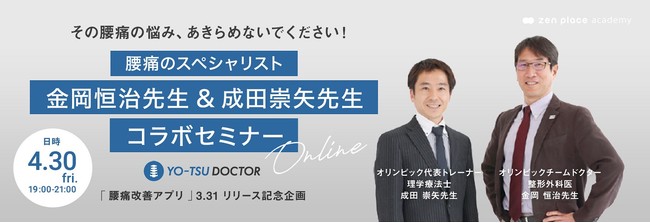 全国に約100店舗ヨガ・ピラティスの専門スタジオを運営する「株式会社ZEN PLACE(本社:東京都渋谷区、代表取締役社長:尾崎成彦)は「YO-TSU DOCTOR(腰痛ドクター)」リリース記念イベントとして「特別コラボセミナー~腰痛に悩む一般の方向け~」をオンラインにて開催いたします。 https://www.bodymindspiritresearchlab.com/workshops/450