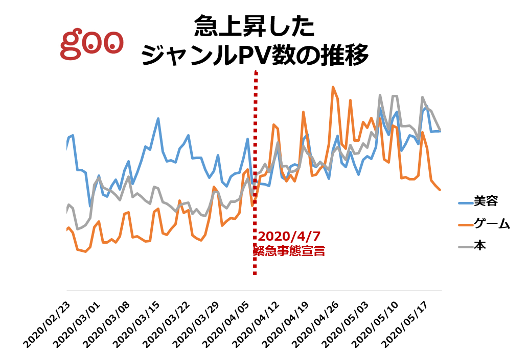 時系列でPV数の推移を見てみると、2020年4月7日(火) 緊急事態宣言の発出後から、「ゲーム」と「本」が特に上昇していることがわかります。