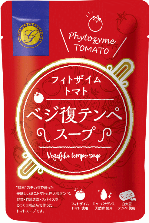 ベジ復テンペスープは、フィトザイムを使った“酵素”のチカラで育った美味しいミニトマトと、タンパク質豊富な白大豆テンペ、野菜・竹焼き塩、スパイスをじっくり煮込んで作ったトマトスープです。