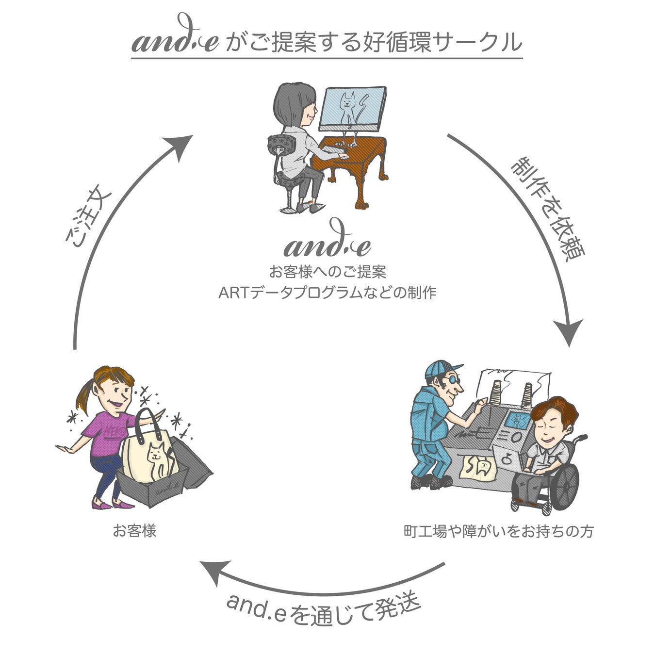 「and.e(アンデ)」とは、ニット編地から伝わる温もりと、最新IT-CGの技術と、工業ニットに特化して30年以上培ってきた専門技術力の3つを結集させて生まれた、お客様と大切な家族との時間を編み込んでお届けするブランドです。SNSなどを介してお預かりしたお写真から、被写体そっくりのCGデータを作り上げて、一般的に洋服を作る工業ニット自動編機を駆使してジャカード編みでCGデータ通りに編み上げ、お好みのお品に仕立ててお届けしています。