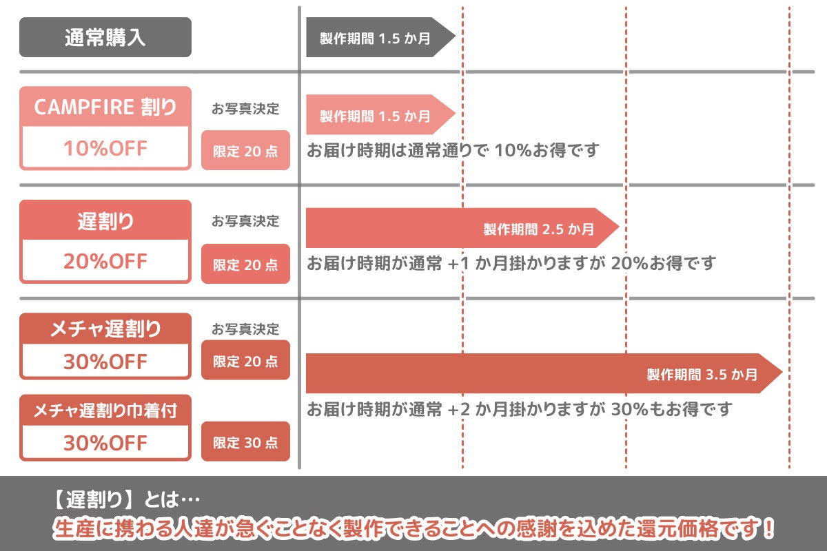 納期が遅いほど割引率が高くなりますので、皆様のご希望に合わせてご選択ください。