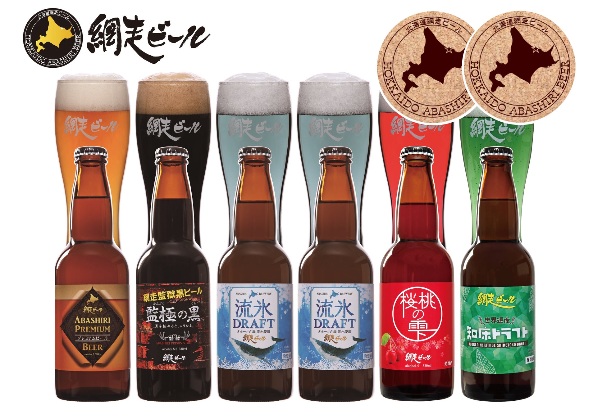 限定セット詳細:・流氷ドラフト330ml×2本、知床ドラフト、桜桃の雫、ABASHIRIプレミアムビール、監極の黒 各330ml×1本、網走ビールコースター2枚