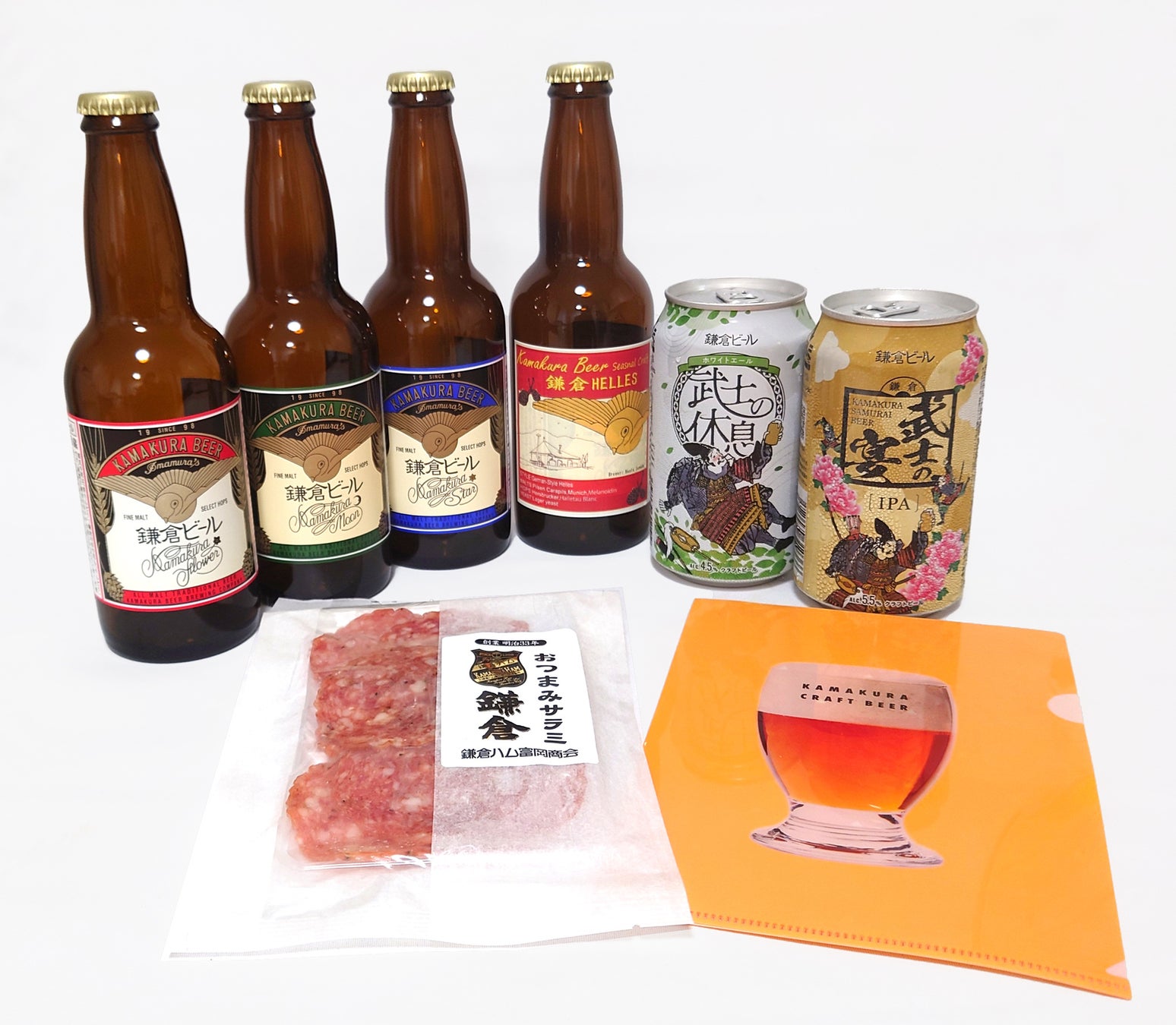 限定セット詳細:・鎌倉ビール月、鎌倉ビール星、鎌倉ビール花、特別醸造ビール 各330ml×1本、鎌倉武士の宴、鎌倉武士の休息 各350ml×1缶、オリジナルクリアファイル 1個、鎌倉ハム富岡商会のおつまみ1種