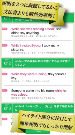 - 各文法に用意された例文は、ポイント部分が赤字で表示されるのでわかりやすい!