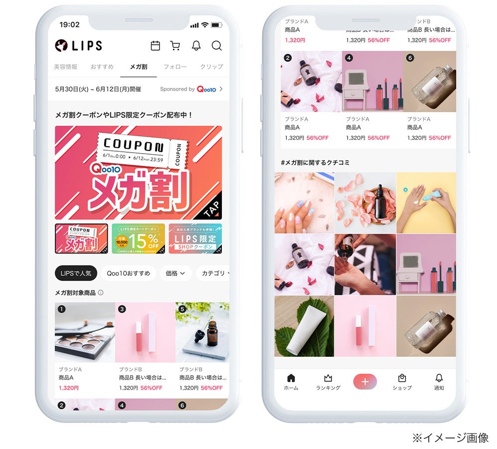 2023年6月1日(木)〜6月12日(月)に実施されるQoo10「メガ割」の開催に合わせ、特別コンテンツ及びQoo10「メガ割」で使用できる、限定クーポンをLIPSアプリ内で提供。