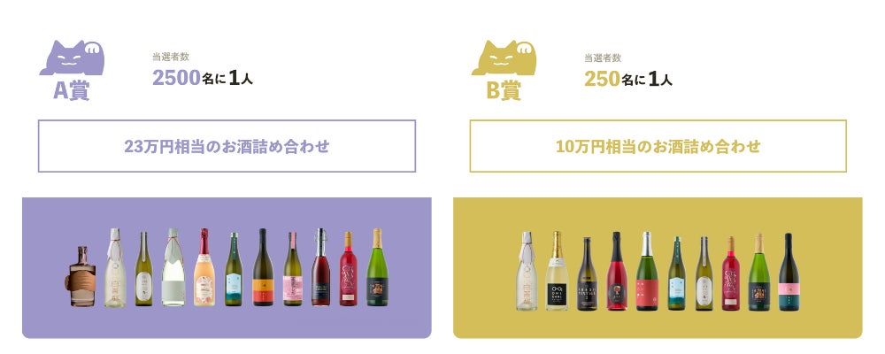 「春の酒ガチャまつり 2023」をご購入者を対象に豪華景品が当たる抽選キャンペーンです。中でも注目は「A賞」です。23万円相当のお酒詰め合わせが、2500人に1人の確率で当選します。ご注文時に応募するだけで簡単にエントリーできます。超豪華景品を狙うもよし、当たる確率の高い商品にかけてみるのもよしのお得な企画です。