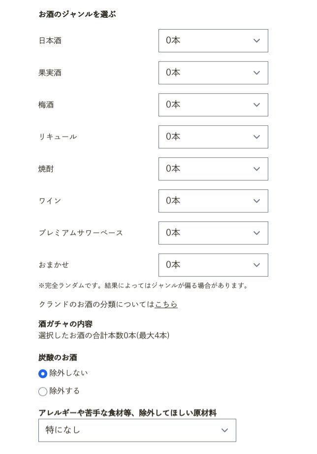日本酒の甘口、辛口などの味わいの好みを指定できるほか、炭酸のお酒を除外することもできるなど、自分の好みに合わせて好きな組み合わせのお酒が届くように指定出来ます。
