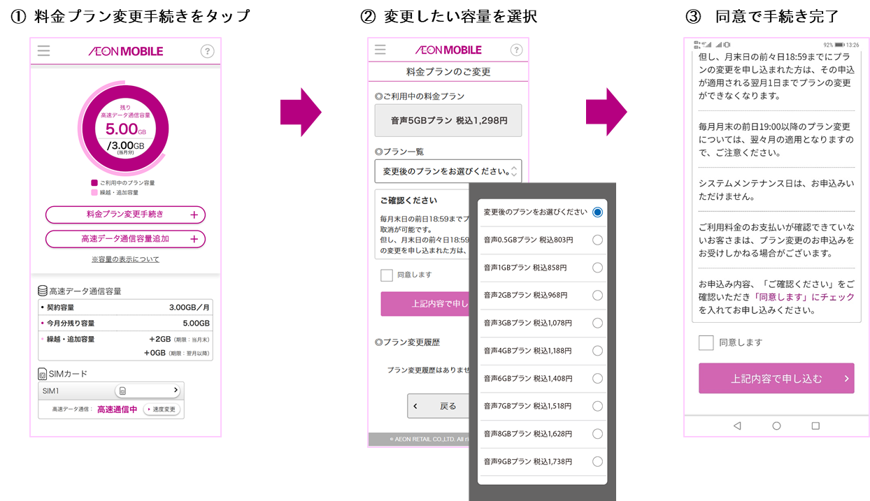 【イオンモバイルの料金プラン(データ通信容量)変更は簡単3ステップ】