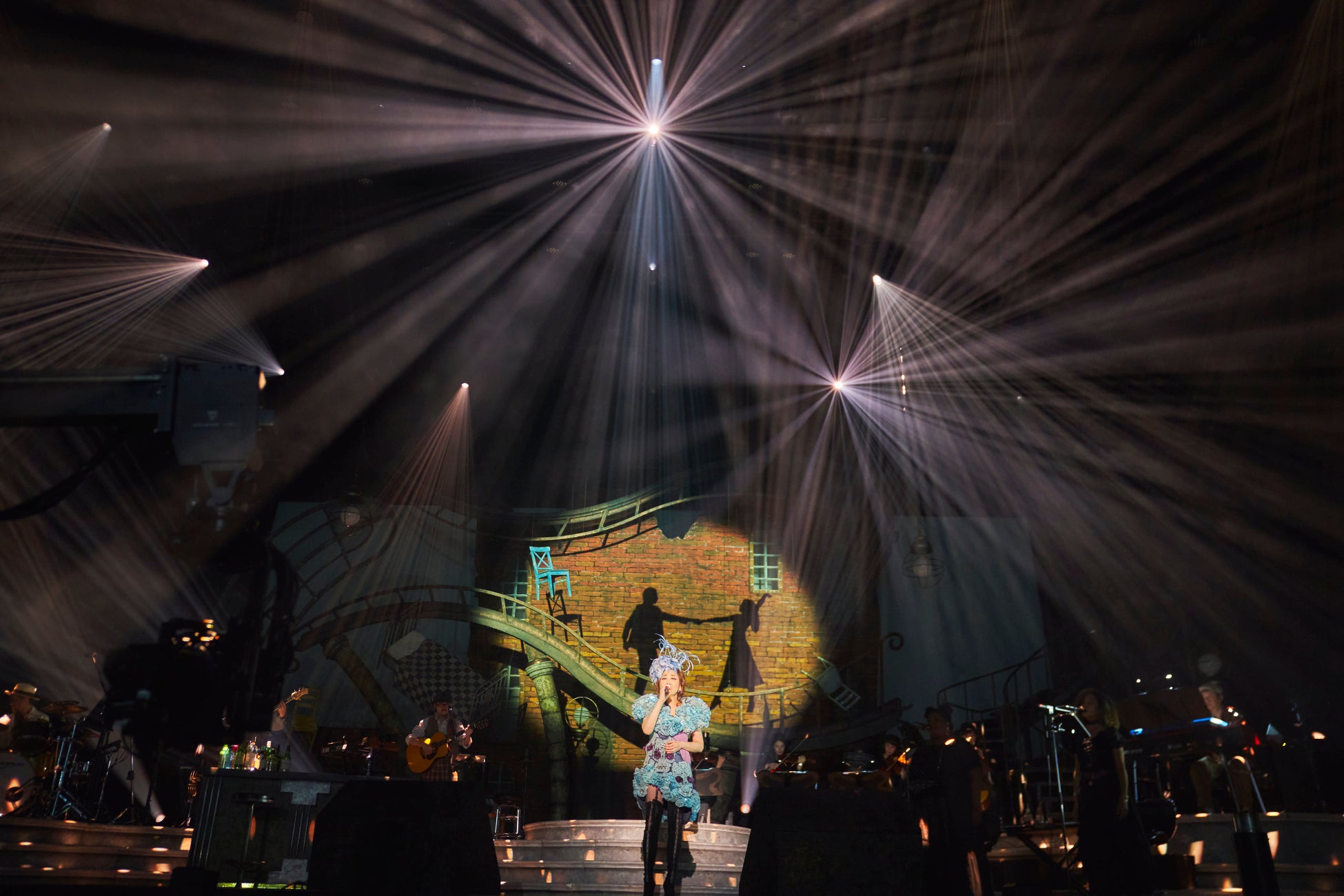 ときおり、絵本を手にその後へと続く物語の1節を朗読するシーンを挟みながら、ショーは色鮮やかに展開されていった。たとえば、「Valentine’s RADIO」ではロマンチックな歌唱でうっとりとさせ、「TUXEDO RAIN」の厳かに愛を誓うようなヴォーカルに合わせ、ダンサーがハッピーな2人を演じ、その多幸感ある姿は影絵のように映し出された。