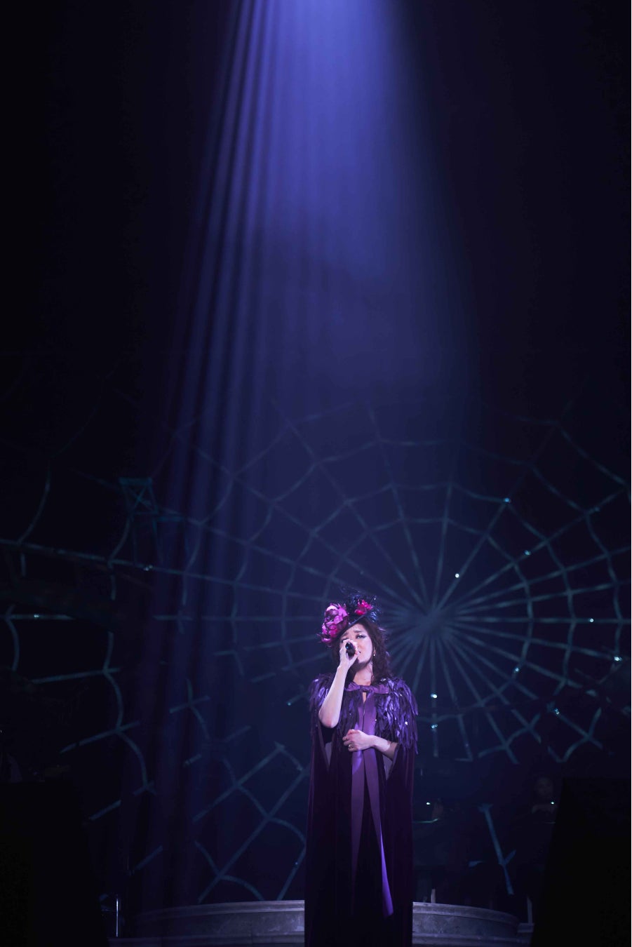 そう、ここからが彼女の魅力がさらに花開くセクションだ。マントに身を包んだ魅惑的な魔女に扮したJUJUは、重厚なロックサウンドに合わせて「ジェラシーと云う名の悪夢」をエモーショナルに歌唱。演出の火柱が、まるで彼女の胸の内に燃え盛る嫉妬の炎のように見えてくるではないか。