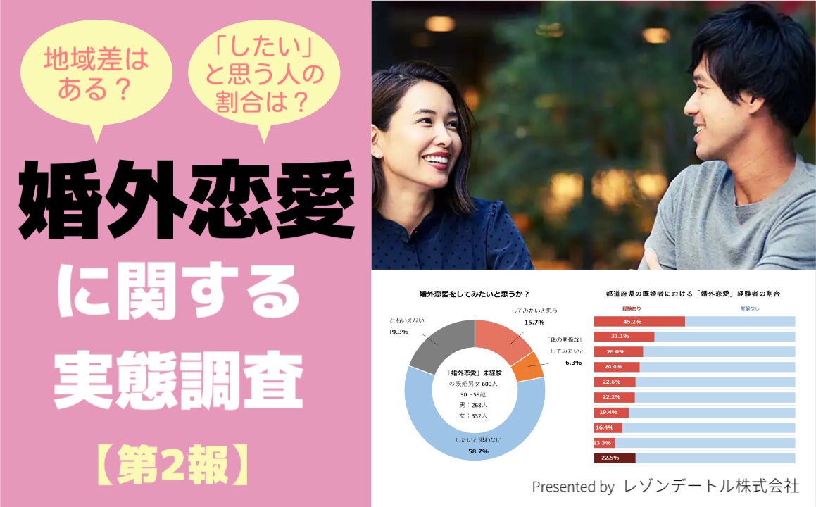 レゾンデートル株式会社では2023年6~7月に「婚外恋愛の実態把握」を目的とした大規模調査を実施しました。今回は「婚外恋愛」の地域差、および未経験者の「婚外恋愛願望」についての第2報告をお届けします。