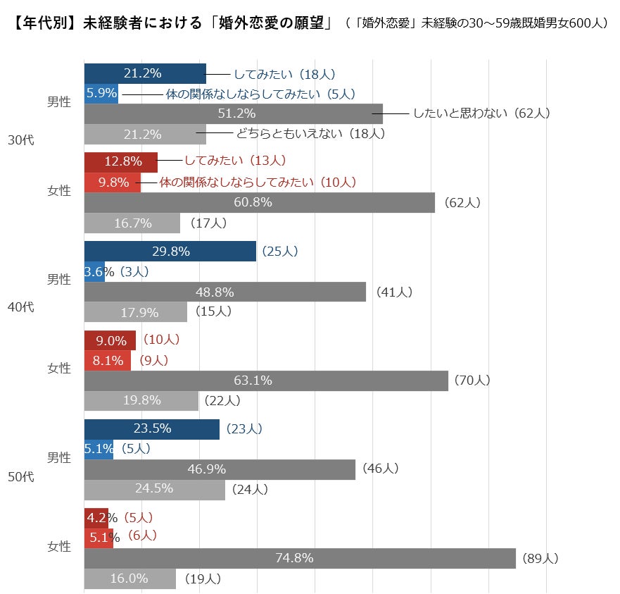 未経験者における「婚外恋愛願望」について年代別・男女別に比較してみたのが次のグラフです。男性は40代で「してみたい」「体の関係なしならしてみたい」の割合が最も高く(33.4%)、女性は「してみたい」「体の関係なしならしてみたい」共に若いほど高割合になることが判明しました。