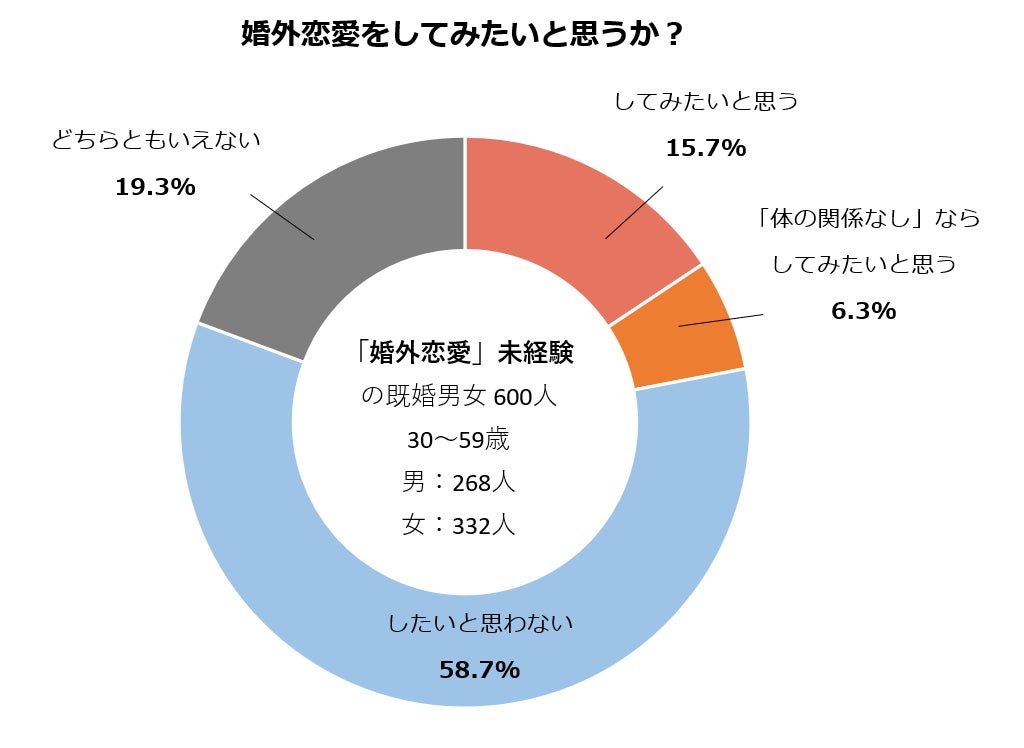 第1報の既婚男女2,000人調査で「婚外恋愛をした経験はない」と回答した1,594人から男女比や年代がばらけるように対象を選び、再調査の承諾を得られた600人(男性268人、女性332人)に「婚外恋愛をしてみたいと思うか」を尋ねたところ、次の結果となりました。
