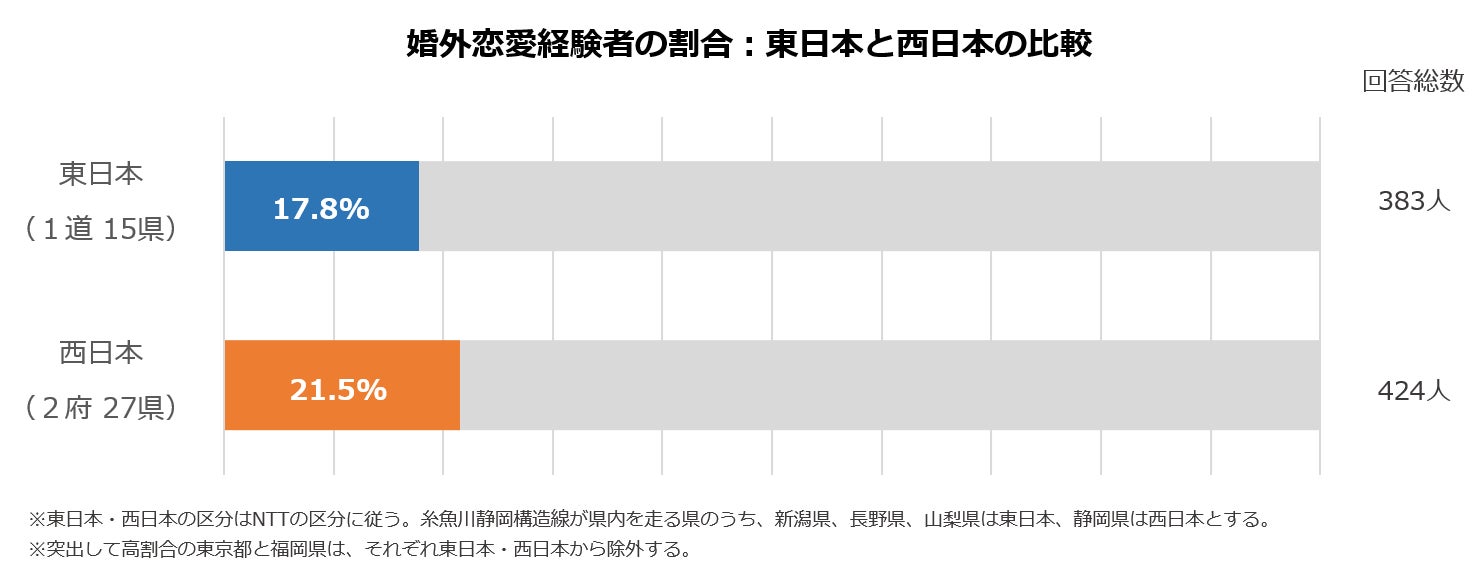 「地域差」に関する分析の最後に、「婚外恋愛」経験者」の割合を東日本と西日本(※2)で比較した結果を紹介します。