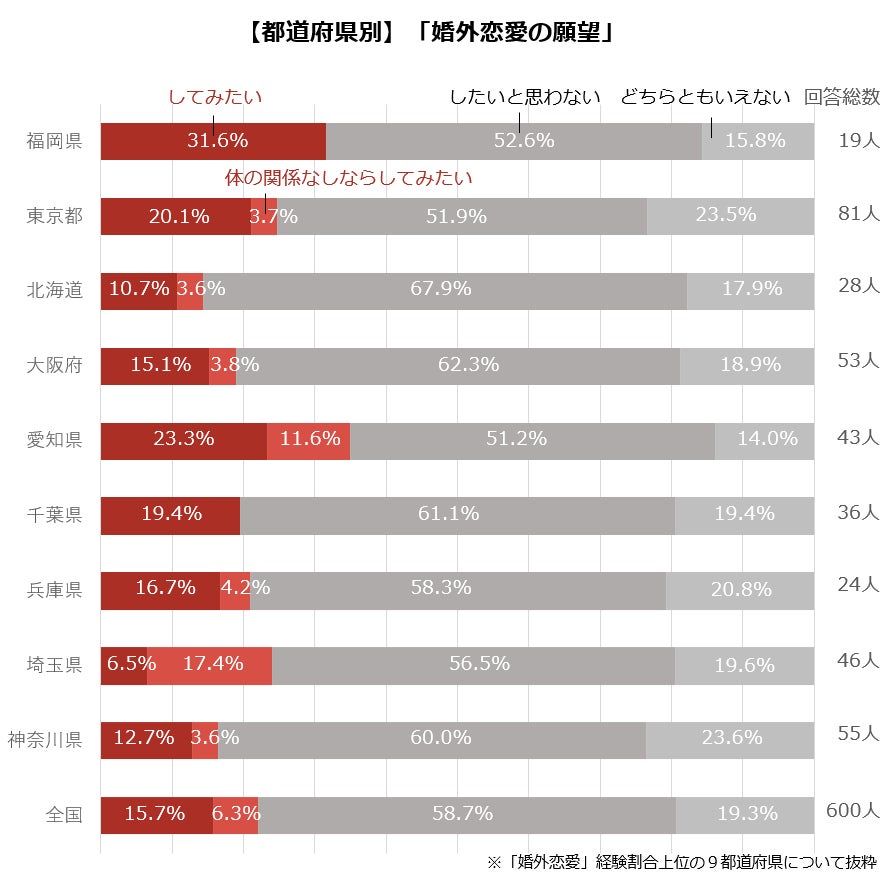 調査サンプルが異なるにもかかわらず、ここでも福岡県・東京都で「婚外恋愛してみたい」という回答の割合が高く、埼玉県・神奈川県で低いという結果が示されました。福岡県と東京都では婚外恋愛への関心が高く、埼玉県と神奈川県では低い傾向にあることの裏付けになるでしょう。