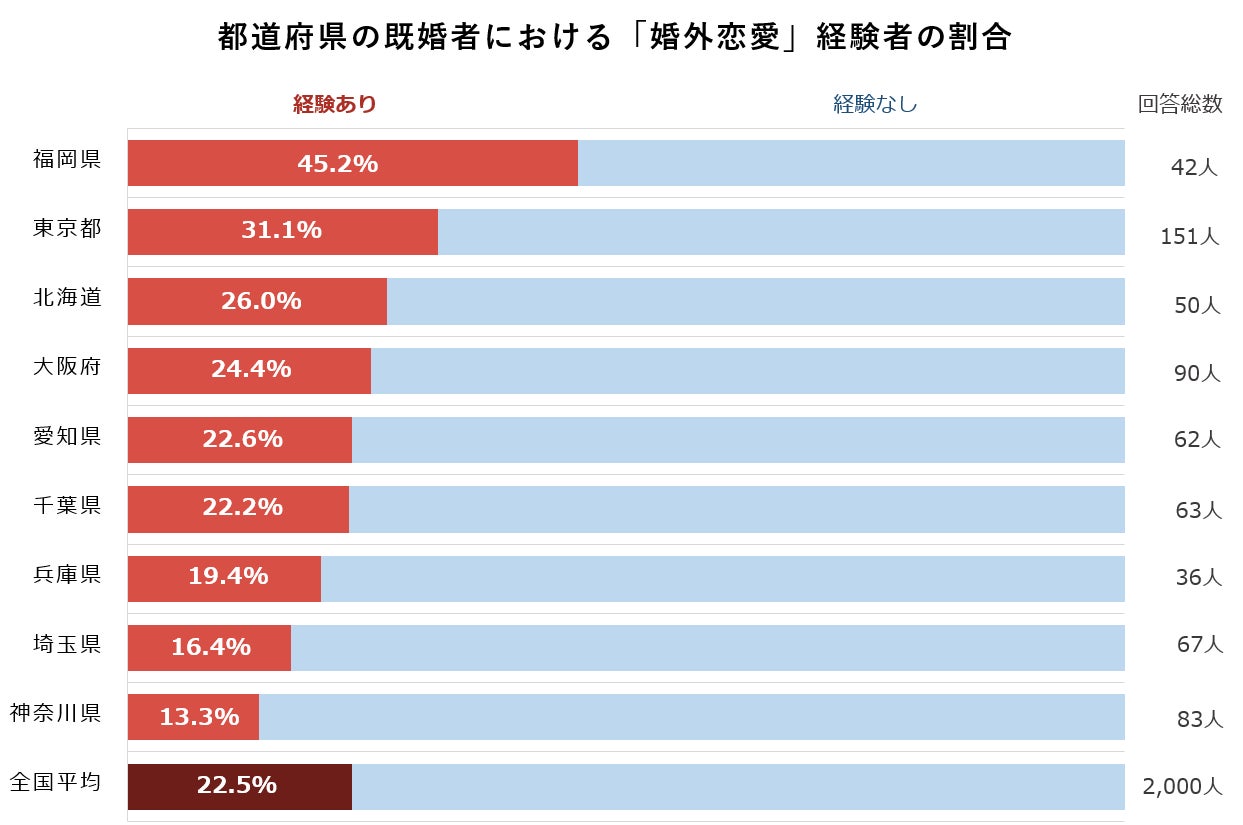 「婚外恋愛の経験あり」と回答した既婚者の割合を都道府県別にみると、全国平均の既婚者の22.5%に対して、福岡県(45.2%)と東京都(31.1%)が突出して高く、埼玉県(16.4%)と神奈川県(13.3%)と目立って低いことが判明しました。