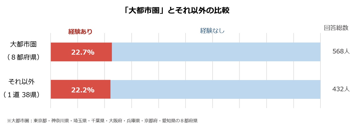 なお、経験者の割合が特に高い東京都と福岡県を除外して比較しても、大都市圏19.66%、それ以外が19.74%で同割合の結果でした。