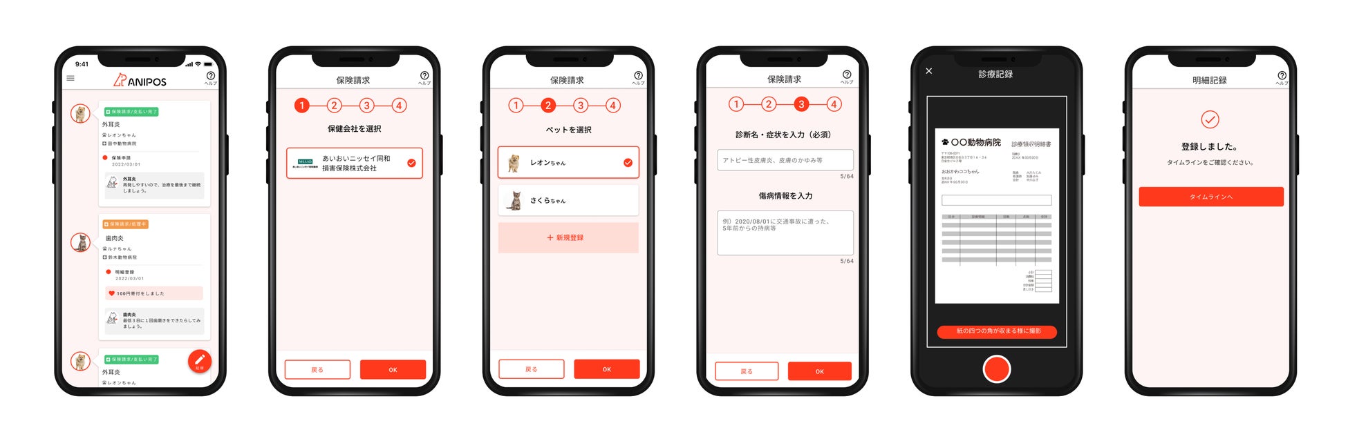 ※1:アニポスアプリサービスは株式会社アニポスが開発し保険事業者へ提供しているペット保険スマホアプリサービスです。請求者は明細書撮影など数ステップの操作で簡単にペット保険請求を行うことができます。