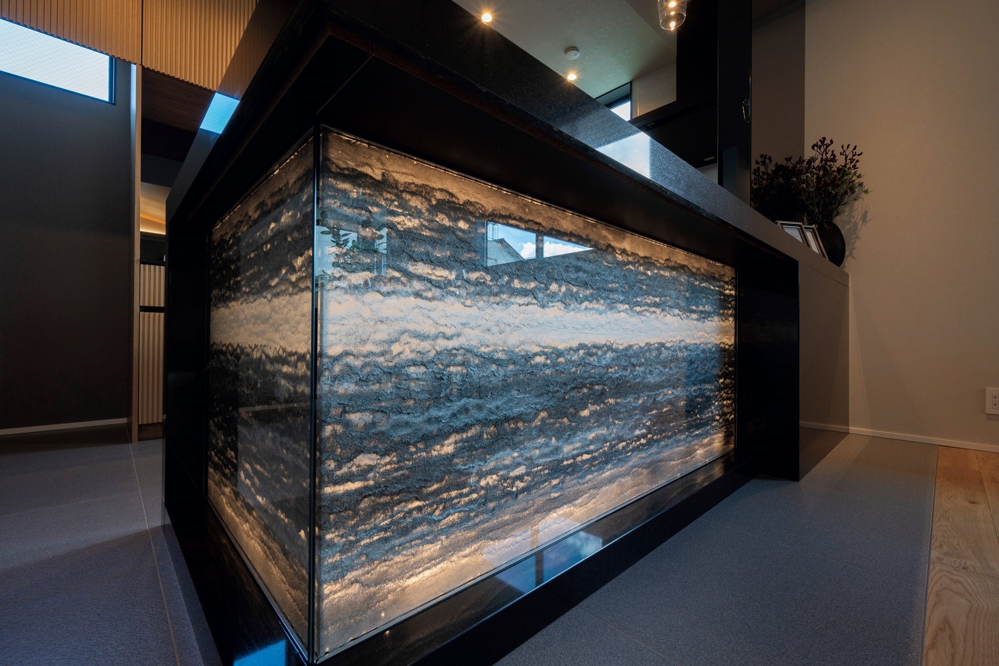 ただし水場であるキッチンに和紙素材を用いることは前例がなく、アート作品をインテリアに取り入れるという試みも初の試みでした。CARRARAの長谷川氏は、海外の「オニックス」と呼ばれる天然石に光を透過させる技術を参考に、2枚の厚いガラス板に豊田小原和紙を挟み、光を後ろから当てる手法を採用。試作と実験を2ヶ月にわたり繰り返し、完成に至りました。