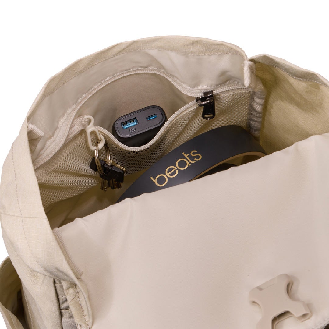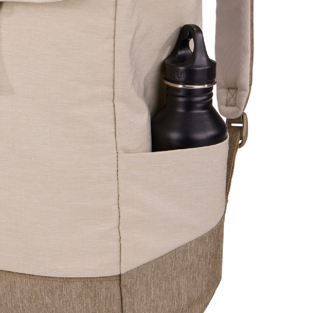 ⾬⽔の⼊り込みにくいフラップ式16Lデイパック。深さのあるサイドポケットで⼤きなボトルも収納でき、気軽な街散策などに便利。