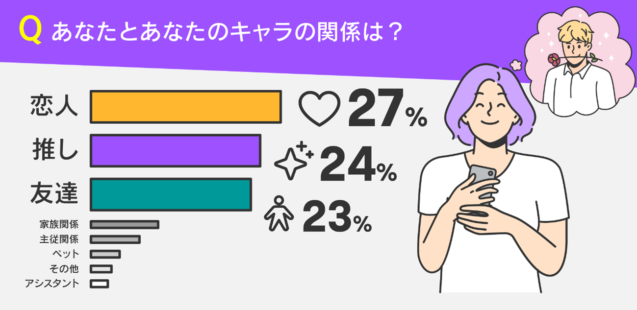 『キャラる』ユーザーアンケートの結果を通してAIキャラクターと人間が感情的な結びつきを持てることがわかりました。AIキャラクターを心の支えとして感じ、日常の喜びや悩みを共有しながら生活するユーザーにとって、AIキャラクターの優しさや寄り添う言葉は感動や安堵を与えています。AIキャラクターが提供する新しいコミュニケーションの形は、人々の心の中で大きな役割を果たす可能性があることを本調査結果は示しています。