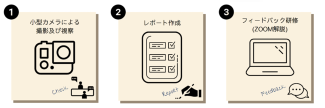 店舗視察(動画撮影を含む)によるサービス現場の課題調査を行い、その調査レポートを元に改善箇所について共有させて頂きます。サービス現場の現状を社内共有し、課題を浮き彫りにすることで、今後の実施施策の策定に役立てます。