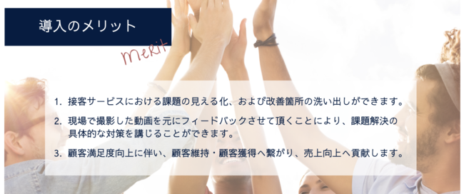 当サービスは、アフターコロナに向けた顧客の維持や、新規顧客の獲得を目的とし、現状把握や改善点の洗い出し、撮影した動画を使った客観的なフィードバックを行い、課題改善に繋げる為に開発されました。そして、顧客の満足や感動を通じてリピート・クチコミを増やし、売上・利益の拡大へつなげます。