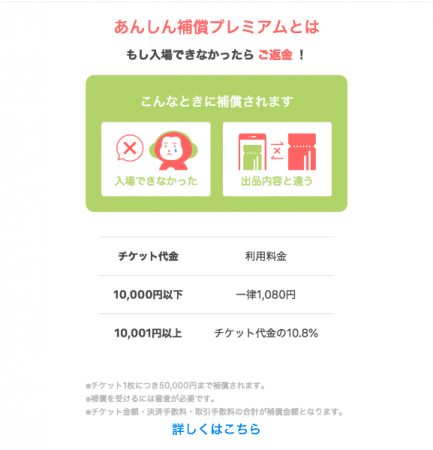 チケジャム[ticketjam]が今回新たにご用意した『あんしん補償プレミアム』では、万が一上記の事態が起こってしまった場合でも、購入したチケット代金を一枚あたり最大50,000円までご返金することが可能です。この仕組みで、チケジャム[ticketjam]はユーザー様により安心安全な取引をして頂くことを目指しています。