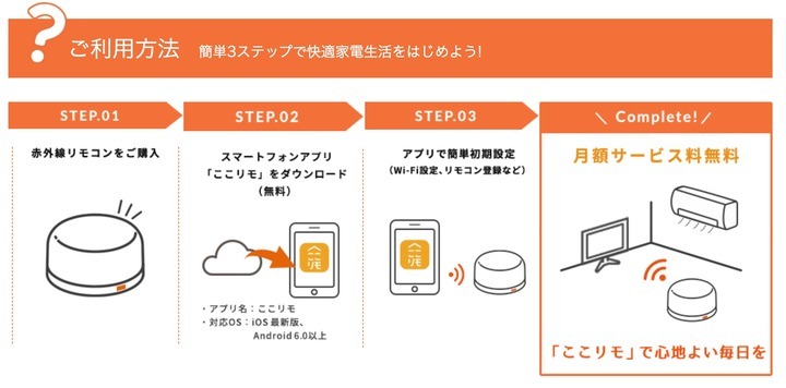 スマートリモコン「ここリモ」は、ご自宅の家電はそのままで、手軽にスマートホームを実現できるサービスです。