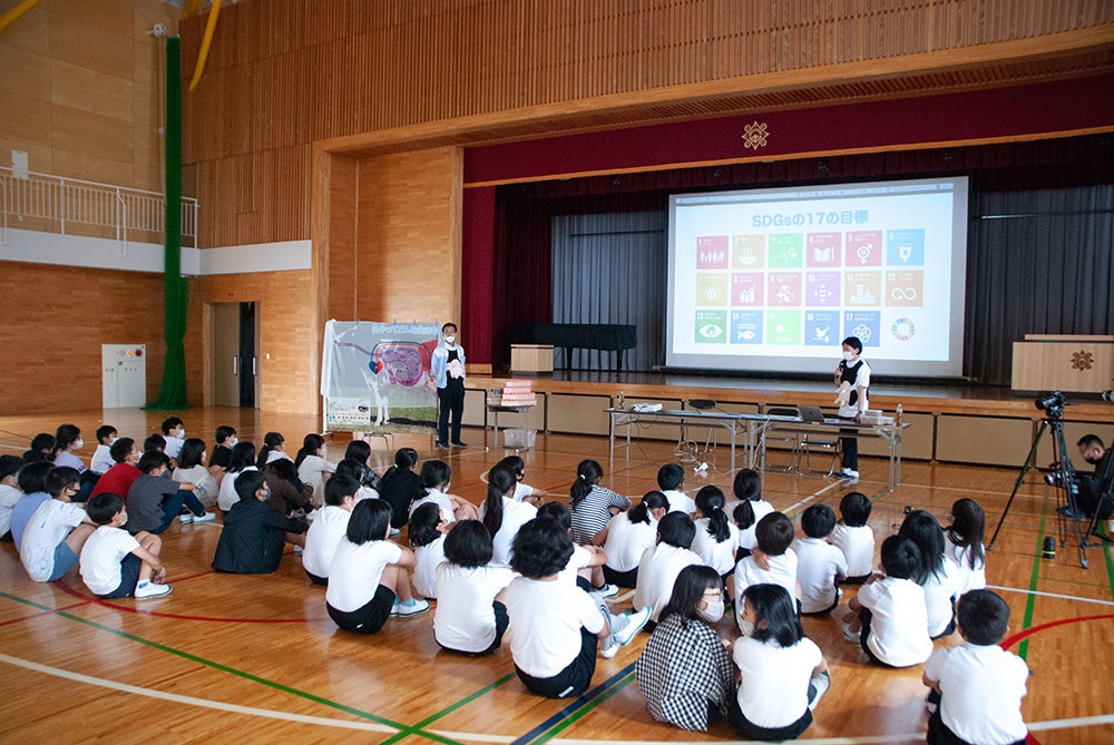 給食に先立って行われた牛乳とフードロスにまつわる特別授業では、ふだん給食で何気なく飲んでいる牛乳ができるまでの過程を、牛の体内の仕組みなども織り混ぜながら紹介するとともに、そうして作られた大切な牛乳が子どもたちにとって身近な食品ロス問題につながっていることを、地球の未来を守るSDGsの観点から解説しました。