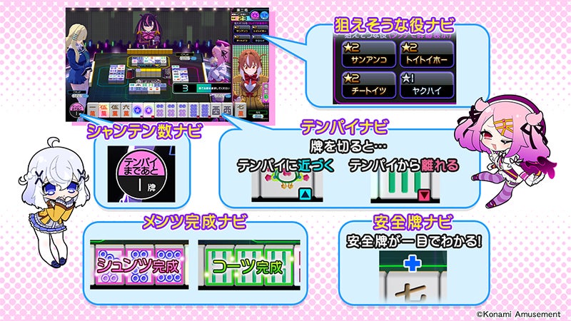 さらに、リーチを狙いやすくする「テンパイナビ」や「テンパイ待ち牌ナビ」をはじめ、