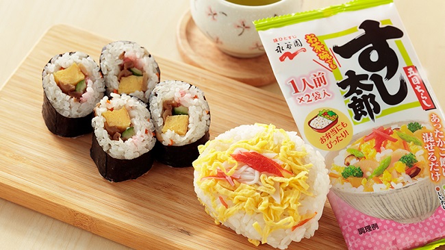 永谷園「すし太郎」を使った混ぜ込みご飯に玉子焼、おぼろ、きゅうり、かんぴょうを具材にした巻寿司です。ごはんは「すし太郎」でしっかり味付けされていますので、醤油をつけずに是非そのままお召し上がりください。