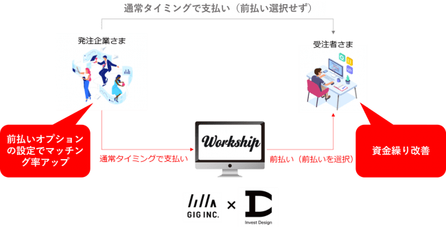 報酬の早払いは、株式会社GIGが運営する、パラレルワーカーやフリーランスの方と企業をつなげるマッチングサービス「Workship」の中で行われ(決済業務はインベストデザイン株式会社が実施)、最低手数料も業界最安値に設定することが可能となりました。