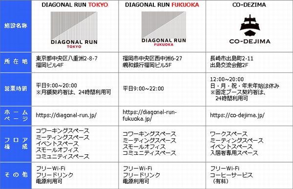 株式会社ふくおかフィナンシャルグループ傘下の株式会社福岡銀行(取締役会長兼頭取 柴戸 隆成)が運営するオープンイノベーション共創拠点 DIAGONAL RUN TOKYO(以下「DRT」)と株式会社親和銀行(取締役頭取 吉澤 俊介)が運営する DIAGONAL RUN FUKUOKA(以下「DRF」)は、この度長崎県が運営するスタートアップ交流拠点 CO-DEJIMA と会員間の施設相互利用を実施することになりましたのでお知らせいたします。