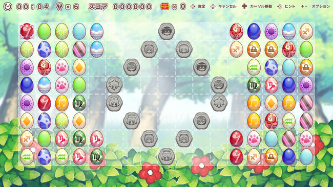 「初音ミク つなげるパズル たまごとり」は、同じ柄のタマゴを見つけて線でつなぎ、線を曲げる回数が2回以内の時に、タマゴを消すことができる2角取りパズルゲームです。カラフルなタマゴを全て消すとステージクリアとなり、イラストパネルを1枚めくることが可能となります。イラストパネルを25枚めくる毎にイラストが解放されますので、全200ステージのクリアを目指しながら、人気イラストレーターによる描き下ろしイラストをお楽しみください。