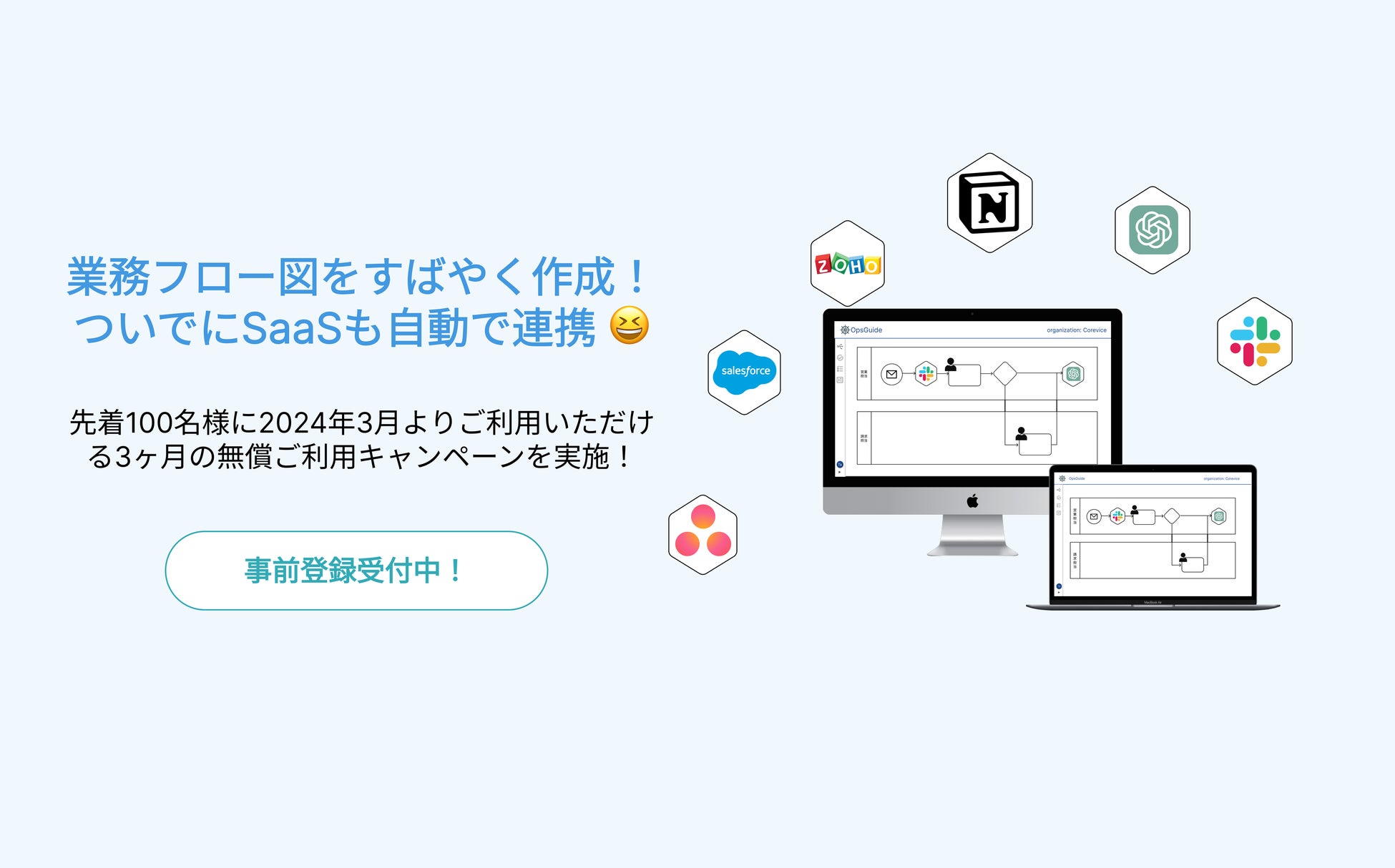 業務フロー図をノーコードで作成でき、作成した業務フロー図をベースに様々なシステムと連携することで、業務を整理しながら自動化までもできる「OpsGuide」が2024年4月リリース!限定キャンペーンも!