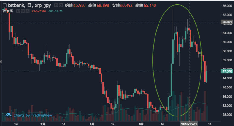 9月18日から4日間、リップル(XRP)が約30円から約70円まで高騰しました。上記が直近のXRPの日足チャートです。これは明らかに大口の投機筋によるものです。大口の投機筋は、為替や株の世界でも同じですが、基本的に「材料(ファンダメンタル)を理由に相場を動かしに」やって来ます。今回の材料は10月1日と2日に開催されたリップル社主催のカンファレンス「SWELL(スウェル)」です。