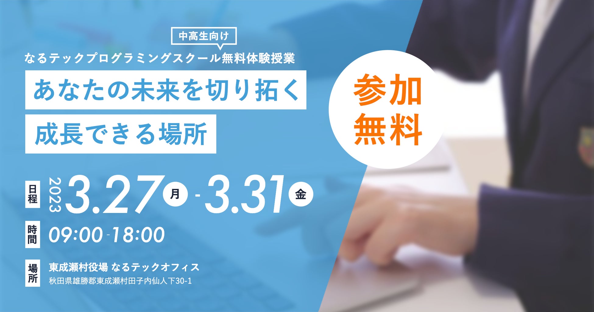 「日本の社会課題をテクノロジーで解決する」が経営目的である東成瀬テックソリューションズ株式会社(本社:秋田県雄勝郡東成瀬村、代表取締役社長:近藤純光、通称「なるテック」)は「なるテック プログラミングスクール 無料体験授業」を実施します。