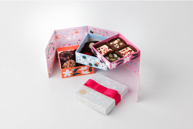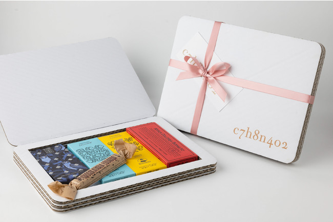 そのままポストに投函できるサイズのチョコレート用のギフトボックスです。もちろん、リボンを結んでそのまま贈り物としても活用できます。店頭で好きなチョコレートを選び、オリジナルの詰め合わせを贈ることができます。