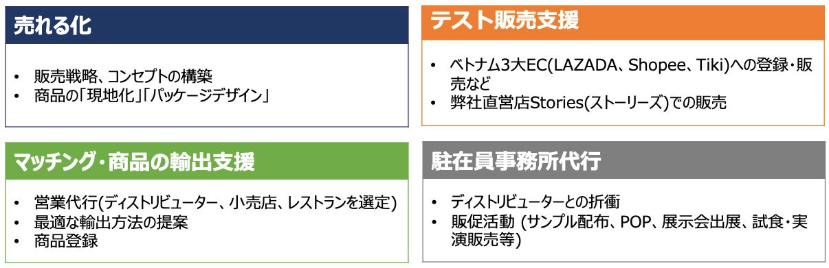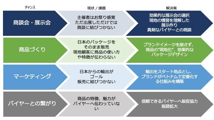 このような従来の課題を解消すべく、私どもは輸出をスタート地点として、商品の価値や魅力をベトナムでいかに伝えるかを主軸に、事業者様の製品をベトナムの人気商品へ、そして定番商品へと“売れる化”するために、戦略策定からブランディング、マーケティング実施までを一緒に「伴走型」支援で取り組んでおります。