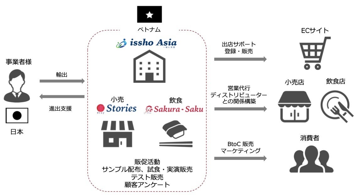 自社直営店「日本商品専門店Stories(ストーリーズ)」、「デリバリー&テイクアウト専門 日本食 Sakura-Saku(さくら咲く)」をホーチミン中心部にて運営しています。徒歩圏内に中間層〜富裕層が住む15,000室のタワーマンションが立ち並ぶエリアに位置します。