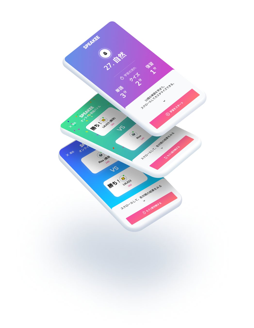 SPEAKEEは学生が効率よく英語学習を続けられるように開発された非常にユニークなアプリです。ネイティブ講師とラーニングデザイナーが英検や受験英語の過去問題を分析することで、効率的に学習することができるコンテンツを提供します。学生は隙間時間を使って簡単に魅力的なミニレッスンを受けることができ、次第に毎日の学習習慣を身につけます。バトルゲームの要素を取り入れることで、英単語の暗記といった単純作業が苦手な学生でも英単語の習得を楽しみながら継続できます。