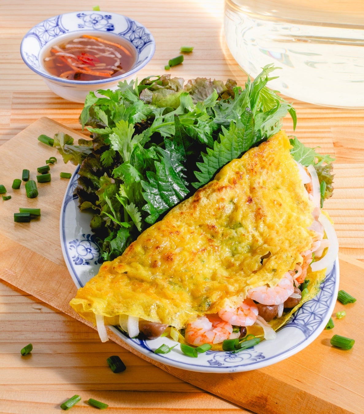その見た目から“ベトナム風お好み焼き”とも呼ばれる粉もの料理「バインセオ(Bánh xèo)」。ベトナム南部発祥の料理で、ベトナムでも広く親しまれている料理の一つです。米粉とターメリックをココナッツミルクで溶いた生地を揚げ焼き、海老や豚肉、もやしや玉ネギ、きのこなどの具材をたっぷり包んで作ります。食べるときは、レタスや香菜などを一緒に巻いて、魚醤ベースのタレにつけていただきます。パリッと香ばしいバインセオを人形町店でお楽しみください!
