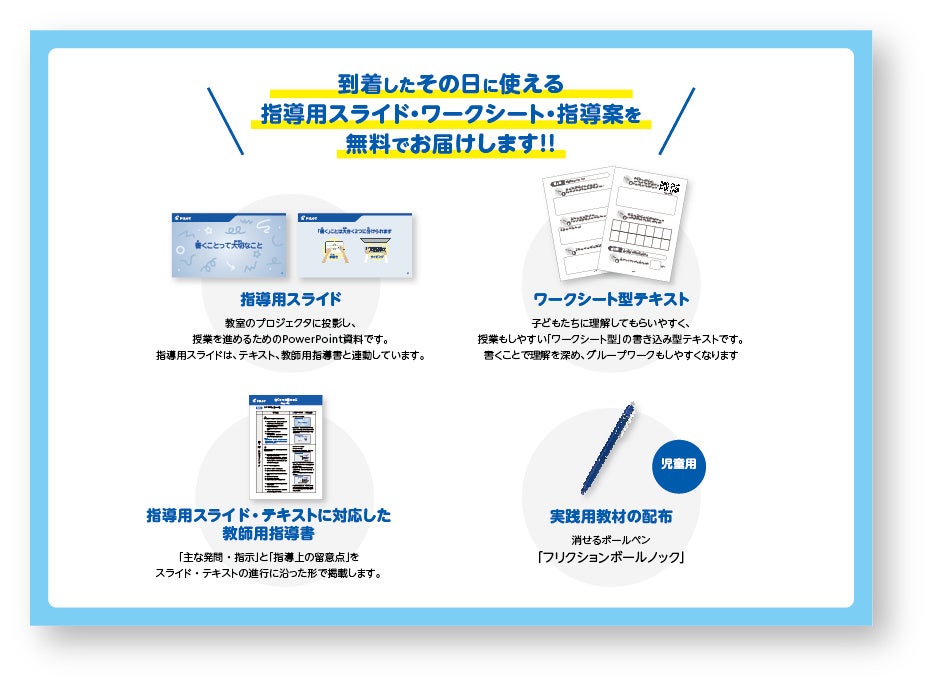 参加児童全員には、パイロット社の消せるボールペン「フリクションボールノック」を1本ずつ提供。手書きの大切さを子どもたちに伝える第一歩として、ぜひご応募ください!