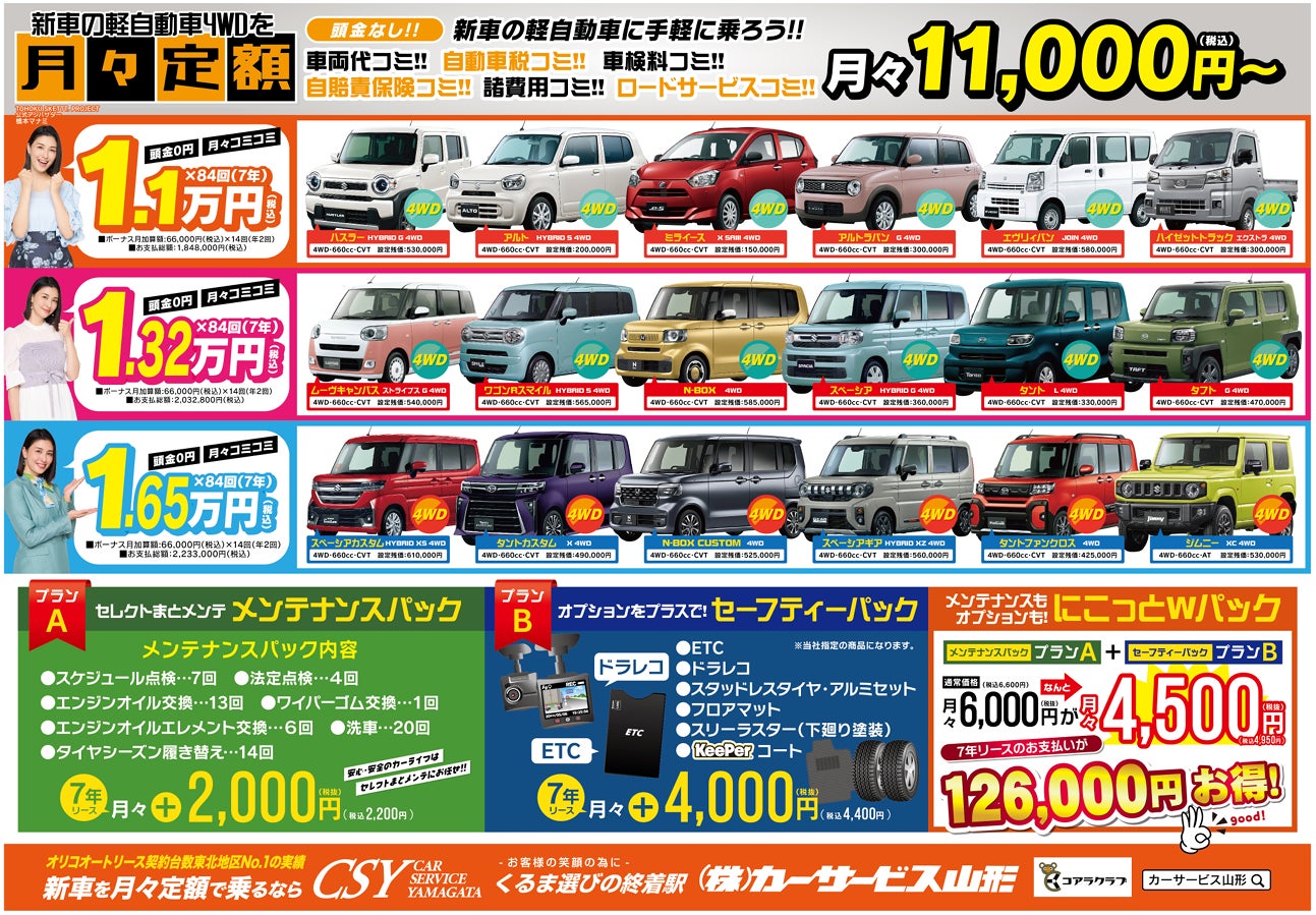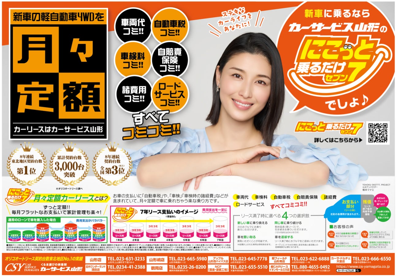カーサービス山形では、地域のご家庭を応援する新たな取り組みとして、月額定額でお車に乗れるサブスク型サービス「にこっと乗るだけセブン」を展開しています。