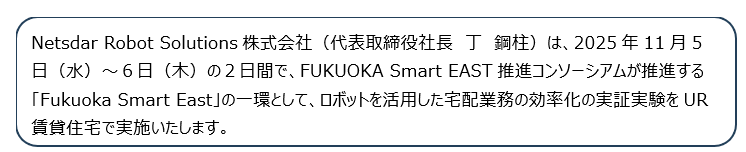 Netsdar Robot Solutions株式会社(代表取締役社長 丁 鋼柱)は、先進的なまちづくりを目指す「Fukuoka Smart East」の一環として、株式会社エヌ・ティ・ティ・データCCS、オプテックス株式会社、日本オーチス・エレベータ株式会社(以上4社共同体)と連携し、ロボットを活用したスマートエントランスシステムの実証実験をUR賃貸住宅にて実施します。