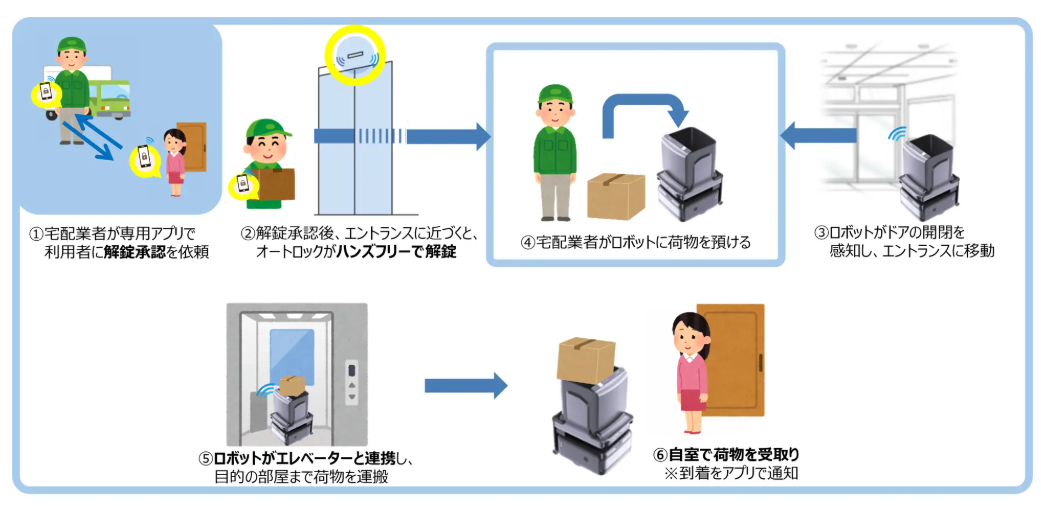 本実証は、集合住宅における宅配業務の作業効率化を目的としており、将来的には宅配業界の人手不足や再配達問題等の課題解決にもつながることが期待されています。