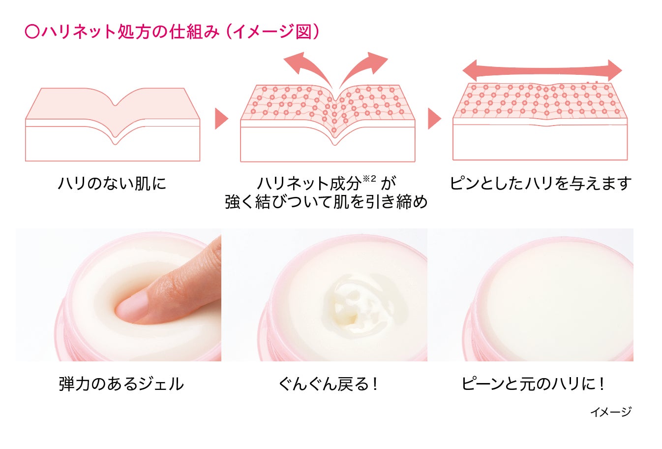 強い復元力*¹を持つハリ成分が、肌の表面にすばやくハリネットを張りめぐらせ、肌にハリ・弾力を作りだし、美しいツヤを与えます。