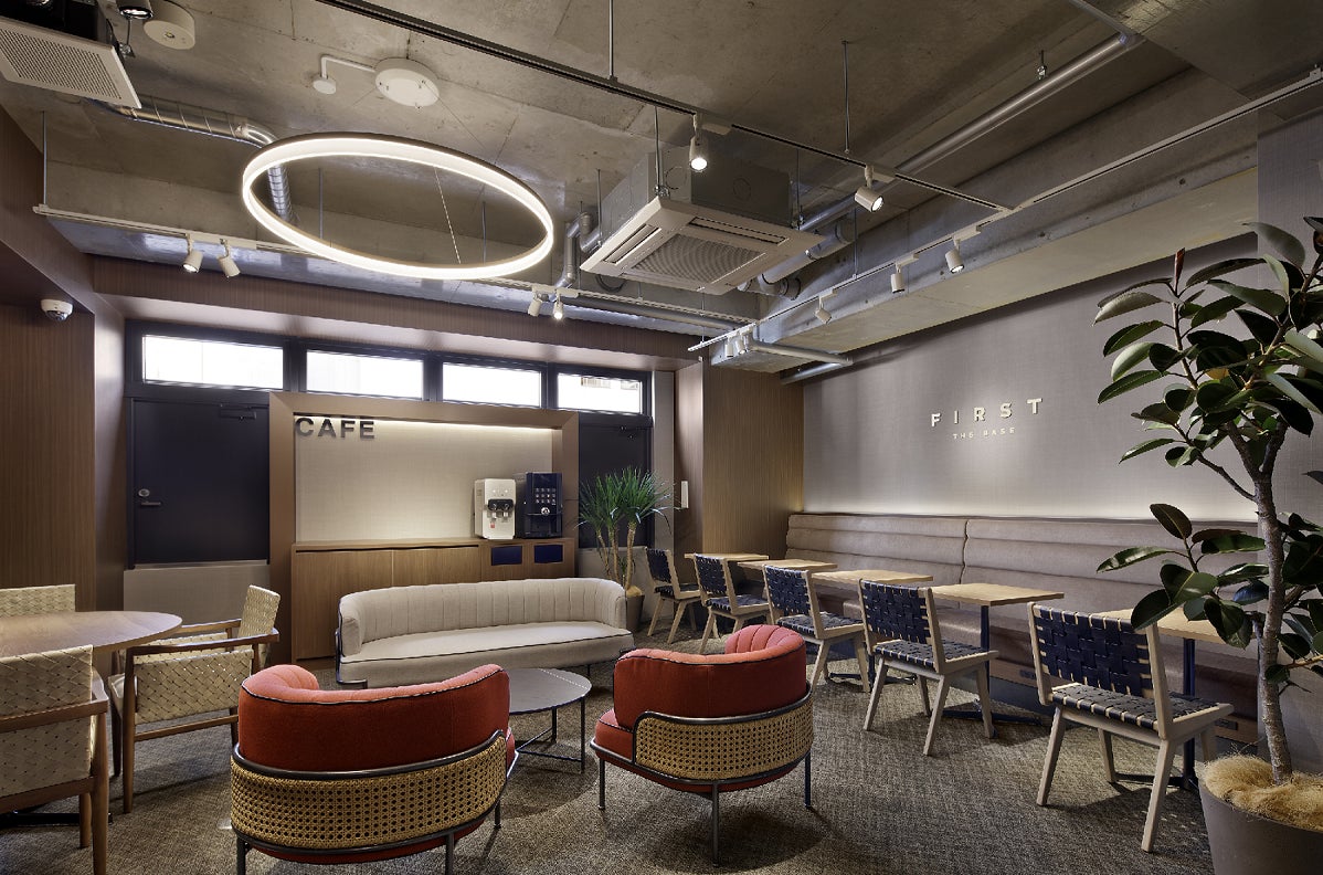 3階の「FIRST THE BASE」は、仕事に集中できるように落ち着いた空間づくりを大切にしながら、ここで仕事をすることに価値を感じられるような上質で都会的なイメージのデザインを目指しました。シェアオフィスにふさわしい⼼地よさや落ち着きがあり、リラックスできる環境・空間となっています。個室プランは1 階のサウナもご利用いただけます。オンタイムもオフタイムも充実したワークスタイルのご提案を目指しました。