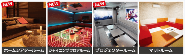 また、音に反応して床面がカラフルに光るお部屋でカラオケが楽しめる「シャイニングフロアルーム」が1室、大画面映像が魅力の「プロジェクタールーム」が1室、靴を脱いでゆったりとくつろげる「マットルーム」を1室、全4室のコンセプトルームを導入しております。全コンセプトルームにおいて、追加のルーム料金はかかりません。